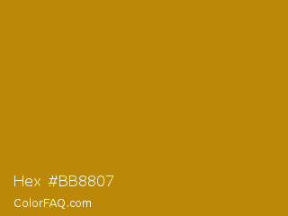 Hex #bb8807 Color is a normal orange color and the nearest color is Dark Goldenrod #b8860b. Hex code #bb8807 and RGB value is rgb(187,136,7). In RGB color space, this color is composed of 73% red, 53% green, 3% blue, In CMYK color space, this color is composed of 0% cyan, 27% magenta, 96% yellow , 27% black , In HSL color space, this color has a hue angle of 43° , 93% saturation and 38% lightness.