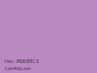 Hex #bb88c4 Color is a light purple color and the nearest color is African Violet #b284be. Hex code #bb88c4 and RGB value is rgb(187,136,196). In RGB color space, this color is composed of 73% red, 53% green, 77% blue, In CMYK color space, this color is composed of 5% cyan, 31% magenta, 0% yellow , 23% black , In HSL color space, this color has a hue angle of 291° , 34% saturation and 65% lightness.