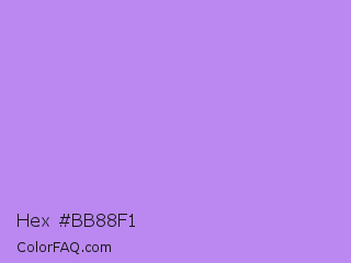 Hex #bb88f1 Color is a light violet color and the nearest color is Bright Lavender #bf94e4. Hex code #bb88f1 and RGB value is rgb(187,136,241). In RGB color space, this color is composed of 73% red, 53% green, 95% blue, In CMYK color space, this color is composed of 22% cyan, 44% magenta, 0% yellow , 5% black , In HSL color space, this color has a hue angle of 269° , 79% saturation and 74% lightness.