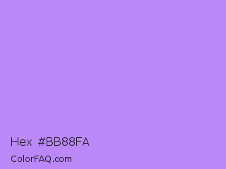 Hex #bb88fa Color is a light violet color and the nearest color is Pale Violet #cc99ff. Hex code #bb88fa and RGB value is rgb(187,136,250). In RGB color space, this color is composed of 73% red, 53% green, 98% blue, In CMYK color space, this color is composed of 25% cyan, 46% magenta, 0% yellow , 2% black , In HSL color space, this color has a hue angle of 267° , 92% saturation and 76% lightness.