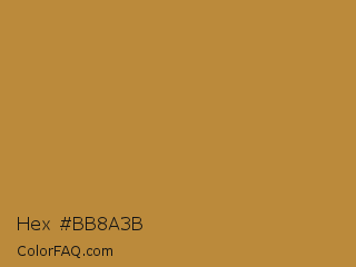 Hex #bb8a3b Color is a normal orange color and the nearest color is Peru #cd853f. Hex code #bb8a3b and RGB value is rgb(187,138,59). In RGB color space, this color is composed of 73% red, 54% green, 23% blue, In CMYK color space, this color is composed of 0% cyan, 26% magenta, 68% yellow , 27% black , In HSL color space, this color has a hue angle of 37° , 52% saturation and 48% lightness.