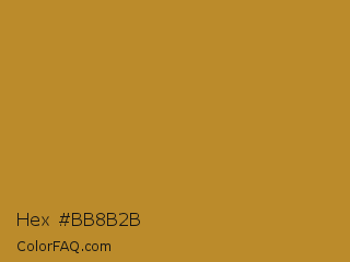 Hex #bb8b2b Color is a normal orange color and the nearest color is Marigold #b98d28. Hex code #bb8b2b and RGB value is rgb(187,139,43). In RGB color space, this color is composed of 73% red, 55% green, 17% blue, In CMYK color space, this color is composed of 0% cyan, 26% magenta, 77% yellow , 27% black , In HSL color space, this color has a hue angle of 40° , 63% saturation and 45% lightness.
