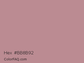 Hex #bb8b92 Color is a light red color and the nearest color is Rosy Brown #bc8f8f. Hex code #bb8b92 and RGB value is rgb(187,139,146). In RGB color space, this color is composed of 73% red, 55% green, 57% blue, In CMYK color space, this color is composed of 0% cyan, 26% magenta, 22% yellow , 27% black , In HSL color space, this color has a hue angle of 351° , 26% saturation and 64% lightness.