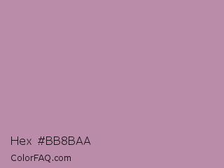 Hex #bb8baa Color is a light magenta color and the nearest color is Opera Mauve #b784a7. Hex code #bb8baa and RGB value is rgb(187,139,170). In RGB color space, this color is composed of 73% red, 55% green, 67% blue, In CMYK color space, this color is composed of 0% cyan, 26% magenta, 9% yellow , 27% black , In HSL color space, this color has a hue angle of 321° , 26% saturation and 64% lightness.