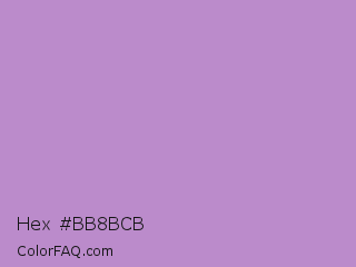 Hex #bb8bcb Color is a light purple color and the nearest color is East Side #ac91ce. Hex code #bb8bcb and RGB value is rgb(187,139,203). In RGB color space, this color is composed of 73% red, 55% green, 80% blue, In CMYK color space, this color is composed of 8% cyan, 32% magenta, 0% yellow , 20% black , In HSL color space, this color has a hue angle of 285° , 38% saturation and 67% lightness.