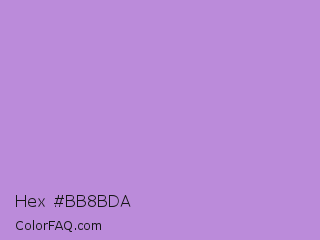 Hex #bb8bda Color is a light purple color and the nearest color is Bright Lavender #bf94e4. Hex code #bb8bda and RGB value is rgb(187,139,218). In RGB color space, this color is composed of 73% red, 55% green, 85% blue, In CMYK color space, this color is composed of 14% cyan, 36% magenta, 0% yellow , 15% black , In HSL color space, this color has a hue angle of 276° , 52% saturation and 70% lightness.