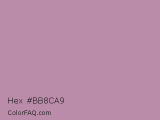 Hex #bb8ca9 Color is a light magenta color and the nearest color is Opera Mauve #b784a7. Hex code #bb8ca9 and RGB value is rgb(187,140,169). In RGB color space, this color is composed of 73% red, 55% green, 66% blue, In CMYK color space, this color is composed of 0% cyan, 25% magenta, 10% yellow , 27% black , In HSL color space, this color has a hue angle of 323° , 26% saturation and 64% lightness.