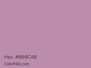 Hex #bb8cab Color is a light magenta color and the nearest color is Opera Mauve #b784a7. Hex code #bb8cab and RGB value is rgb(187,140,171). In RGB color space, this color is composed of 73% red, 55% green, 67% blue, In CMYK color space, this color is composed of 0% cyan, 25% magenta, 9% yellow , 27% black , In HSL color space, this color has a hue angle of 320° , 26% saturation and 64% lightness.