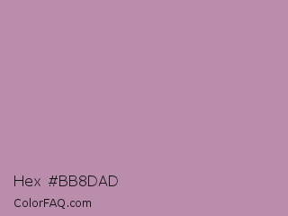 Hex #bb8dad Color is a light magenta color and the nearest color is Opera Mauve #b784a7. Hex code #bb8dad and RGB value is rgb(187,141,173). In RGB color space, this color is composed of 73% red, 55% green, 68% blue, In CMYK color space, this color is composed of 0% cyan, 25% magenta, 7% yellow , 27% black , In HSL color space, this color has a hue angle of 318° , 25% saturation and 64% lightness.