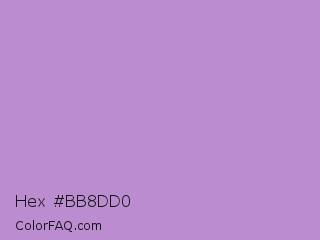 Hex #bb8dd0 Color is a light purple color and the nearest color is East Side #ac91ce. Hex code #bb8dd0 and RGB value is rgb(187,141,208). In RGB color space, this color is composed of 73% red, 55% green, 82% blue, In CMYK color space, this color is composed of 10% cyan, 32% magenta, 0% yellow , 18% black , In HSL color space, this color has a hue angle of 281° , 42% saturation and 68% lightness.