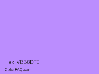 Hex #bb8dfe Color is a light violet color and the nearest color is Pale Violet #cc99ff. Hex code #bb8dfe and RGB value is rgb(187,141,254). In RGB color space, this color is composed of 73% red, 55% green, 100% blue, In CMYK color space, this color is composed of 26% cyan, 44% magenta, 0% yellow , 0% black , In HSL color space, this color has a hue angle of 264° , 98% saturation and 77% lightness.