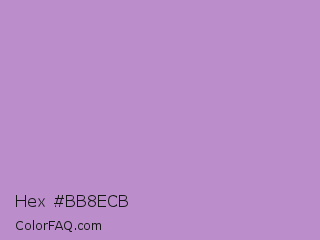 Hex #bb8ecb Color is a light purple color and the nearest color is East Side #ac91ce. Hex code #bb8ecb and RGB value is rgb(187,142,203). In RGB color space, this color is composed of 73% red, 56% green, 80% blue, In CMYK color space, this color is composed of 8% cyan, 30% magenta, 0% yellow , 20% black , In HSL color space, this color has a hue angle of 284° , 37% saturation and 68% lightness.