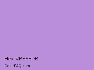 Hex #bb8edb Color is a light purple color and the nearest color is Bright Lavender #bf94e4. Hex code #bb8edb and RGB value is rgb(187,142,219). In RGB color space, this color is composed of 73% red, 56% green, 86% blue, In CMYK color space, this color is composed of 15% cyan, 35% magenta, 0% yellow , 14% black , In HSL color space, this color has a hue angle of 275° , 52% saturation and 71% lightness.