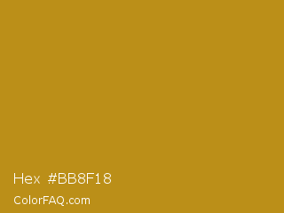 Hex #bb8f18 Color is a normal orange color and the nearest color is Pizza #c99415. Hex code #bb8f18 and RGB value is rgb(187,143,24). In RGB color space, this color is composed of 73% red, 56% green, 9% blue, In CMYK color space, this color is composed of 0% cyan, 24% magenta, 87% yellow , 27% black , In HSL color space, this color has a hue angle of 44° , 77% saturation and 41% lightness.