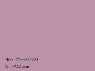 Hex #bb92a9 Color is a light magenta color and the nearest color is Lilac Luster #ae98aa. Hex code #bb92a9 and RGB value is rgb(187,146,169). In RGB color space, this color is composed of 73% red, 57% green, 66% blue, In CMYK color space, this color is composed of 0% cyan, 22% magenta, 10% yellow , 27% black , In HSL color space, this color has a hue angle of 326° , 23% saturation and 65% lightness.