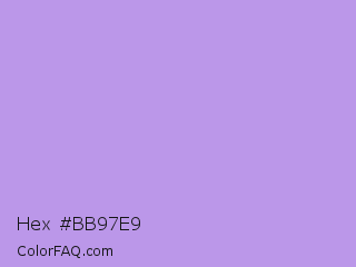 Hex #bb97e9 Color is a light violet color and the nearest color is Bright Lavender #bf94e4. Hex code #bb97e9 and RGB value is rgb(187,151,233). In RGB color space, this color is composed of 73% red, 59% green, 91% blue, In CMYK color space, this color is composed of 20% cyan, 35% magenta, 0% yellow , 9% black , In HSL color space, this color has a hue angle of 266° , 65% saturation and 75% lightness.