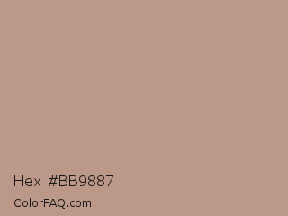 Hex #bb9887 Color is a light orange color and the nearest color is Quicksand #bd978e. Hex code #bb9887 and RGB value is rgb(187,152,135). In RGB color space, this color is composed of 73% red, 60% green, 53% blue, In CMYK color space, this color is composed of 0% cyan, 19% magenta, 28% yellow , 27% black , In HSL color space, this color has a hue angle of 20° , 28% saturation and 63% lightness.