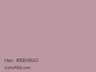 Hex #bb98a0 Color is a light red color and the nearest color is Tuscany #c09999. Hex code #bb98a0 and RGB value is rgb(187,152,160). In RGB color space, this color is composed of 73% red, 60% green, 63% blue, In CMYK color space, this color is composed of 0% cyan, 19% magenta, 14% yellow , 27% black , In HSL color space, this color has a hue angle of 346° , 20% saturation and 66% lightness.