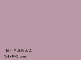 Hex #bb98a5 Color is a light rose color and the nearest color is Tuscany #c09999. Hex code #bb98a5 and RGB value is rgb(187,152,165). In RGB color space, this color is composed of 73% red, 60% green, 65% blue, In CMYK color space, this color is composed of 0% cyan, 19% magenta, 12% yellow , 27% black , In HSL color space, this color has a hue angle of 338° , 20% saturation and 66% lightness.