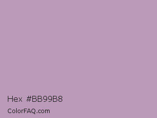 Hex #bb99b8 Color is a light magenta color and the nearest color is Pastel Purple #b39eb5. Hex code #bb99b8 and RGB value is rgb(187,153,184). In RGB color space, this color is composed of 73% red, 60% green, 72% blue, In CMYK color space, this color is composed of 0% cyan, 18% magenta, 2% yellow , 27% black , In HSL color space, this color has a hue angle of 305° , 20% saturation and 67% lightness.