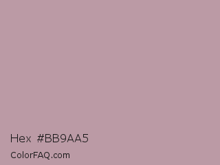Hex #bb9aa5 Color is a light rose color and the nearest color is Tuscany #c09999. Hex code #bb9aa5 and RGB value is rgb(187,154,165). In RGB color space, this color is composed of 73% red, 60% green, 65% blue, In CMYK color space, this color is composed of 0% cyan, 18% magenta, 12% yellow , 27% black , In HSL color space, this color has a hue angle of 340° , 20% saturation and 67% lightness.