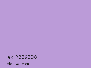 Hex #bb9bd8 Color is a light purple color and the nearest color is Light Pastel Purple #b19cd9. Hex code #bb9bd8 and RGB value is rgb(187,155,216). In RGB color space, this color is composed of 73% red, 61% green, 85% blue, In CMYK color space, this color is composed of 13% cyan, 28% magenta, 0% yellow , 15% black , In HSL color space, this color has a hue angle of 271° , 44% saturation and 73% lightness.