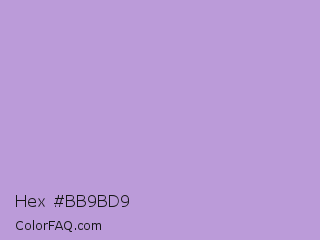 Hex #bb9bd9 Color is a light purple color and the nearest color is Light Pastel Purple #b19cd9. Hex code #bb9bd9 and RGB value is rgb(187,155,217). In RGB color space, this color is composed of 73% red, 61% green, 85% blue, In CMYK color space, this color is composed of 14% cyan, 29% magenta, 0% yellow , 15% black , In HSL color space, this color has a hue angle of 271° , 45% saturation and 73% lightness.
