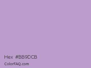 Hex #bb9dcb Color is a light purple color and the nearest color is London Hue #bea6c3. Hex code #bb9dcb and RGB value is rgb(187,157,203). In RGB color space, this color is composed of 73% red, 62% green, 80% blue, In CMYK color space, this color is composed of 8% cyan, 23% magenta, 0% yellow , 20% black , In HSL color space, this color has a hue angle of 279° , 31% saturation and 71% lightness.