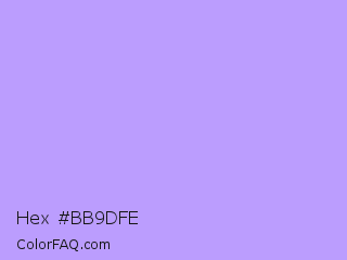 Hex #bb9dfe Color is a very light indigo color and the nearest color is Pale Violet #cc99ff. Hex code #bb9dfe and RGB value is rgb(187,157,254). In RGB color space, this color is composed of 73% red, 62% green, 100% blue, In CMYK color space, this color is composed of 26% cyan, 38% magenta, 0% yellow , 0% black , In HSL color space, this color has a hue angle of 259° , 98% saturation and 81% lightness.