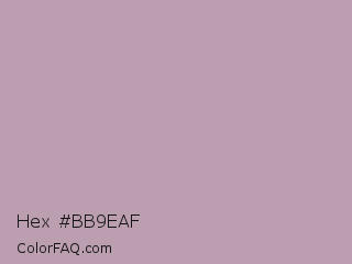 Hex #bb9eaf Color is a light magenta color and the nearest color is Pastel Purple #b39eb5. Hex code #bb9eaf and RGB value is rgb(187,158,175). In RGB color space, this color is composed of 73% red, 62% green, 69% blue, In CMYK color space, this color is composed of 0% cyan, 16% magenta, 6% yellow , 27% black , In HSL color space, this color has a hue angle of 325° , 18% saturation and 68% lightness.