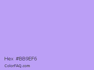 Hex #bb9ef6 Color is a light indigo color and the nearest color is Biloba Flower #b2a1ea. Hex code #bb9ef6 and RGB value is rgb(187,158,246). In RGB color space, this color is composed of 73% red, 62% green, 96% blue, In CMYK color space, this color is composed of 24% cyan, 36% magenta, 0% yellow , 4% black , In HSL color space, this color has a hue angle of 260° , 83% saturation and 79% lightness.
