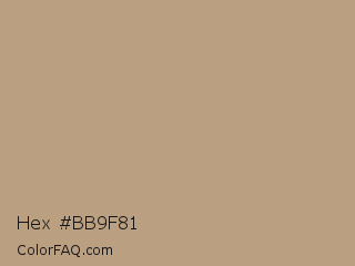 Hex #bb9f81 Color is a light orange color and the nearest color is Mongoose #b5a27f. Hex code #bb9f81 and RGB value is rgb(187,159,129). In RGB color space, this color is composed of 73% red, 62% green, 51% blue, In CMYK color space, this color is composed of 0% cyan, 15% magenta, 31% yellow , 27% black , In HSL color space, this color has a hue angle of 31° , 30% saturation and 62% lightness.