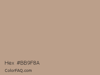 Hex #bb9f8a Color is a light orange color and the nearest color is Quicksand #bd978e. Hex code #bb9f8a and RGB value is rgb(187,159,138). In RGB color space, this color is composed of 73% red, 62% green, 54% blue, In CMYK color space, this color is composed of 0% cyan, 15% magenta, 26% yellow , 27% black , In HSL color space, this color has a hue angle of 26° , 26% saturation and 64% lightness.