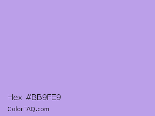 Hex #bb9fe9 Color is a light violet color and the nearest color is Biloba Flower #b2a1ea. Hex code #bb9fe9 and RGB value is rgb(187,159,233). In RGB color space, this color is composed of 73% red, 62% green, 91% blue, In CMYK color space, this color is composed of 20% cyan, 32% magenta, 0% yellow , 9% black , In HSL color space, this color has a hue angle of 263° , 63% saturation and 77% lightness.