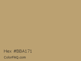 Hex #bba171 Color is a normal orange color and the nearest color is Desert Camel #c19a6b. Hex code #bba171 and RGB value is rgb(187,161,113). In RGB color space, this color is composed of 73% red, 63% green, 44% blue, In CMYK color space, this color is composed of 0% cyan, 14% magenta, 40% yellow , 27% black , In HSL color space, this color has a hue angle of 39° , 35% saturation and 59% lightness.