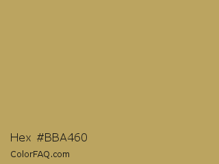 Hex #bba460 Color is a normal orange color and the nearest color is Husk #b7a458. Hex code #bba460 and RGB value is rgb(187,164,96). In RGB color space, this color is composed of 73% red, 64% green, 38% blue, In CMYK color space, this color is composed of 0% cyan, 12% magenta, 49% yellow , 27% black , In HSL color space, this color has a hue angle of 45° , 40% saturation and 55% lightness.