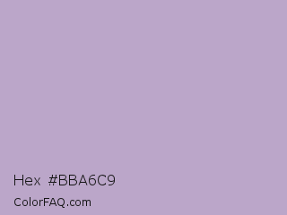 Hex #bba6c9 Color is a light purple color and the nearest color is London Hue #bea6c3. Hex code #bba6c9 and RGB value is rgb(187,166,201). In RGB color space, this color is composed of 73% red, 65% green, 79% blue, In CMYK color space, this color is composed of 7% cyan, 17% magenta, 0% yellow , 21% black , In HSL color space, this color has a hue angle of 276° , 24% saturation and 72% lightness.