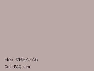 Hex #bba7a6 Color is a light red color and the nearest color is Silk #bdb1a8. Hex code #bba7a6 and RGB value is rgb(187,167,166). In RGB color space, this color is composed of 73% red, 65% green, 65% blue, In CMYK color space, this color is composed of 0% cyan, 11% magenta, 11% yellow , 27% black , In HSL color space, this color has a hue angle of 3° , 13% saturation and 69% lightness.