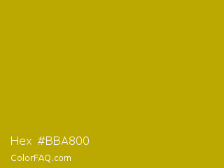 Hex #bba800 Color is a normal yellow color and the nearest color is Buddha Gold #c1a004. Hex code #bba800 and RGB value is rgb(187,168,0). In RGB color space, this color is composed of 73% red, 66% green, 0% blue, In CMYK color space, this color is composed of 0% cyan, 10% magenta, 100% yellow , 27% black , In HSL color space, this color has a hue angle of 54° , 100% saturation and 37% lightness.