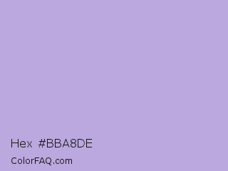 Hex #bba8de Color is a light violet color and the nearest color is Light Wisteria #c9a0dc. Hex code #bba8de and RGB value is rgb(187,168,222). In RGB color space, this color is composed of 73% red, 66% green, 87% blue, In CMYK color space, this color is composed of 16% cyan, 24% magenta, 0% yellow , 13% black , In HSL color space, this color has a hue angle of 261° , 45% saturation and 76% lightness.