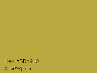 Hex #bba940 Color is a normal yellow color and the nearest color is Brass #b5a642. Hex code #bba940 and RGB value is rgb(187,169,64). In RGB color space, this color is composed of 73% red, 66% green, 25% blue, In CMYK color space, this color is composed of 0% cyan, 10% magenta, 66% yellow , 27% black , In HSL color space, this color has a hue angle of 51° , 49% saturation and 49% lightness.