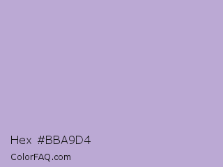 Hex #bba9d4 Color is a light violet color and the nearest color is Chatelle #bdb3c7. Hex code #bba9d4 and RGB value is rgb(187,169,212). In RGB color space, this color is composed of 73% red, 66% green, 83% blue, In CMYK color space, this color is composed of 12% cyan, 20% magenta, 0% yellow , 17% black , In HSL color space, this color has a hue angle of 265° , 33% saturation and 75% lightness.