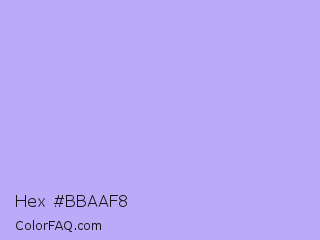 Hex #bbaaf8 Color is a very light indigo color and the nearest color is Biloba Flower #b2a1ea. Hex code #bbaaf8 and RGB value is rgb(187,170,248). In RGB color space, this color is composed of 73% red, 67% green, 97% blue, In CMYK color space, this color is composed of 25% cyan, 31% magenta, 0% yellow , 3% black , In HSL color space, this color has a hue angle of 253° , 85% saturation and 82% lightness.