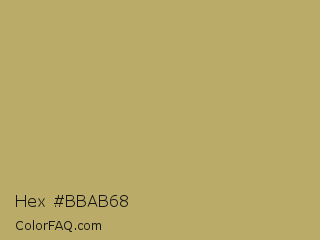 Hex #bbab68 Color is a normal yellow color and the nearest color is Gimblet #b8b56a. Hex code #bbab68 and RGB value is rgb(187,171,104). In RGB color space, this color is composed of 73% red, 67% green, 41% blue, In CMYK color space, this color is composed of 0% cyan, 9% magenta, 44% yellow , 27% black , In HSL color space, this color has a hue angle of 48° , 38% saturation and 57% lightness.