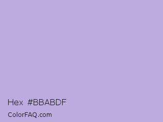 Hex #bbabdf Color is a light indigo color and the nearest color is Maximum Blue Purple #acace6. Hex code #bbabdf and RGB value is rgb(187,171,223). In RGB color space, this color is composed of 73% red, 67% green, 87% blue, In CMYK color space, this color is composed of 16% cyan, 23% magenta, 0% yellow , 13% black , In HSL color space, this color has a hue angle of 258° , 45% saturation and 77% lightness.