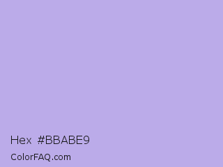 Hex #bbabe9 Color is a light indigo color and the nearest color is Biloba Flower #b2a1ea. Hex code #bbabe9 and RGB value is rgb(187,171,233). In RGB color space, this color is composed of 73% red, 67% green, 91% blue, In CMYK color space, this color is composed of 20% cyan, 27% magenta, 0% yellow , 9% black , In HSL color space, this color has a hue angle of 255° , 58% saturation and 79% lightness.