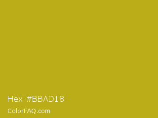 Hex #bbad18 Color is a normal yellow color and the nearest color is Sahara #b7a214. Hex code #bbad18 and RGB value is rgb(187,173,24). In RGB color space, this color is composed of 73% red, 68% green, 9% blue, In CMYK color space, this color is composed of 0% cyan, 7% magenta, 87% yellow , 27% black , In HSL color space, this color has a hue angle of 55° , 77% saturation and 41% lightness.
