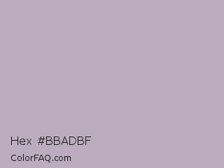 Hex #bbadbf Color is a light purple color and the nearest color is London Hue #bea6c3. Hex code #bbadbf and RGB value is rgb(187,173,191). In RGB color space, this color is composed of 73% red, 68% green, 75% blue, In CMYK color space, this color is composed of 2% cyan, 9% magenta, 0% yellow , 25% black , In HSL color space, this color has a hue angle of 287° , 12% saturation and 71% lightness.
