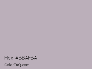 Hex #bbafba Color is a light magenta color and the nearest color is Pink Swan #beb5b7. Hex code #bbafba and RGB value is rgb(187,175,186). In RGB color space, this color is composed of 73% red, 69% green, 73% blue, In CMYK color space, this color is composed of 0% cyan, 6% magenta, 1% yellow , 27% black , In HSL color space, this color has a hue angle of 305° , 8% saturation and 71% lightness.