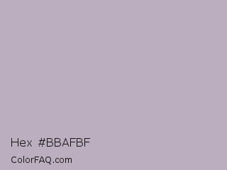 Hex #bbafbf Color is a light purple color and the nearest color is Chatelle #bdb3c7. Hex code #bbafbf and RGB value is rgb(187,175,191). In RGB color space, this color is composed of 73% red, 69% green, 75% blue, In CMYK color space, this color is composed of 2% cyan, 8% magenta, 0% yellow , 25% black , In HSL color space, this color has a hue angle of 285° , 11% saturation and 72% lightness.